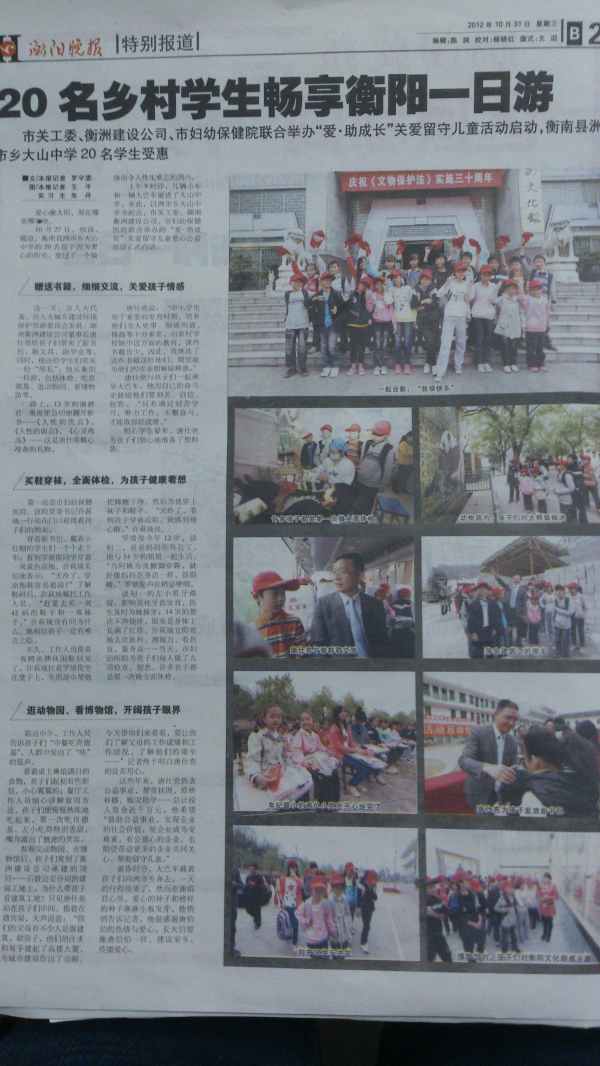 10月27日,由市關(guān)工委牽頭組織、我司承辦的關(guān)愛(ài)留守兒童愛(ài)心活動(dòng)在衡陽(yáng)市婦幼保健院舉行,活動(dòng)組織了來(lái)自衡南縣的20留守兒童代表參加,我司向這些留守兒童捐贈了書(shū)包、字典等文具,中午安排他們在肯德基就餐,餐后帶領(lǐng)他們先后游覽了衡陽(yáng)市動(dòng)物園、衡陽(yáng)市博物館,最后到達我司承建的石鼓公安分局業(yè)務(wù)用房項目參觀(guān)。