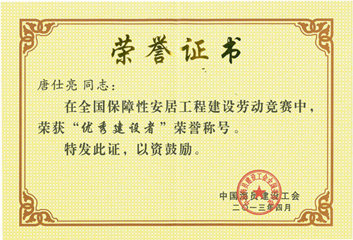 2013年4月,唐仕亮同志在由中國海員建工會(huì )舉辦的全國保障性安居工程建設勞動(dòng)競賽中榮獲“優(yōu)秀建設者”的稱(chēng)號